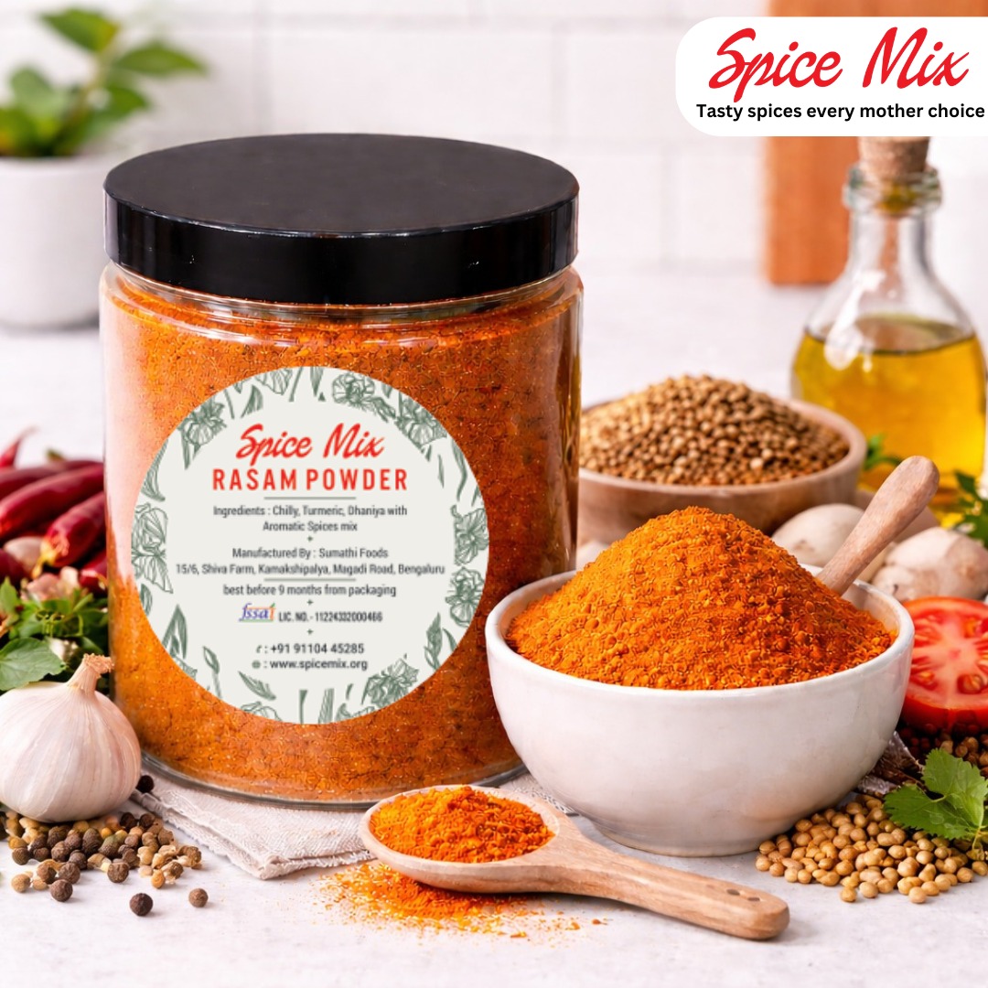 Freshly packed in Bangalore, Karnataka, Spice Mix Rasam Powder is trusted by households for its authentic flavour, purity, and consistent quality.